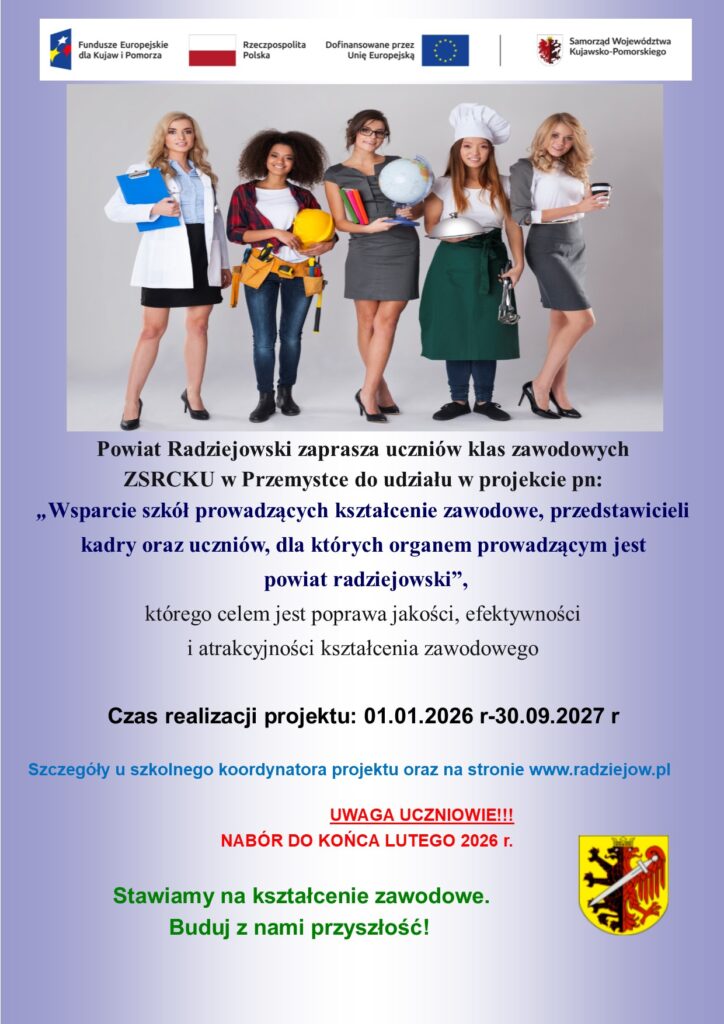 Trwa rekrutacja uczniów klas zawodowych Zespołu Szkół Mechanicznych w Radziejowie i Zespołu Szkół Rolnicze Centrum Kształcenia Ustawicznego w Przemystce do udziału w projekcie „Wsparcie szkół prowadzących kształcenie zawodowe, przedstawicieli kadry oraz uczniów, dla których organem prowadzącym jest powiat radziejowski” nr FEKP.08.28-IZ.00-0001/25 współfinansowanego z Europejskiego Funduszu Społecznego Plus w ramach Priorytetu 8 Fundusze europejskie na wsparcie w obszarze rynku pracy, edukacji i włączenia społecznego Działania 08.28 Kształcenie zawodowe OPPT programu Fundusze Europejskie dla Kujaw i Pomorza 2021-2027.